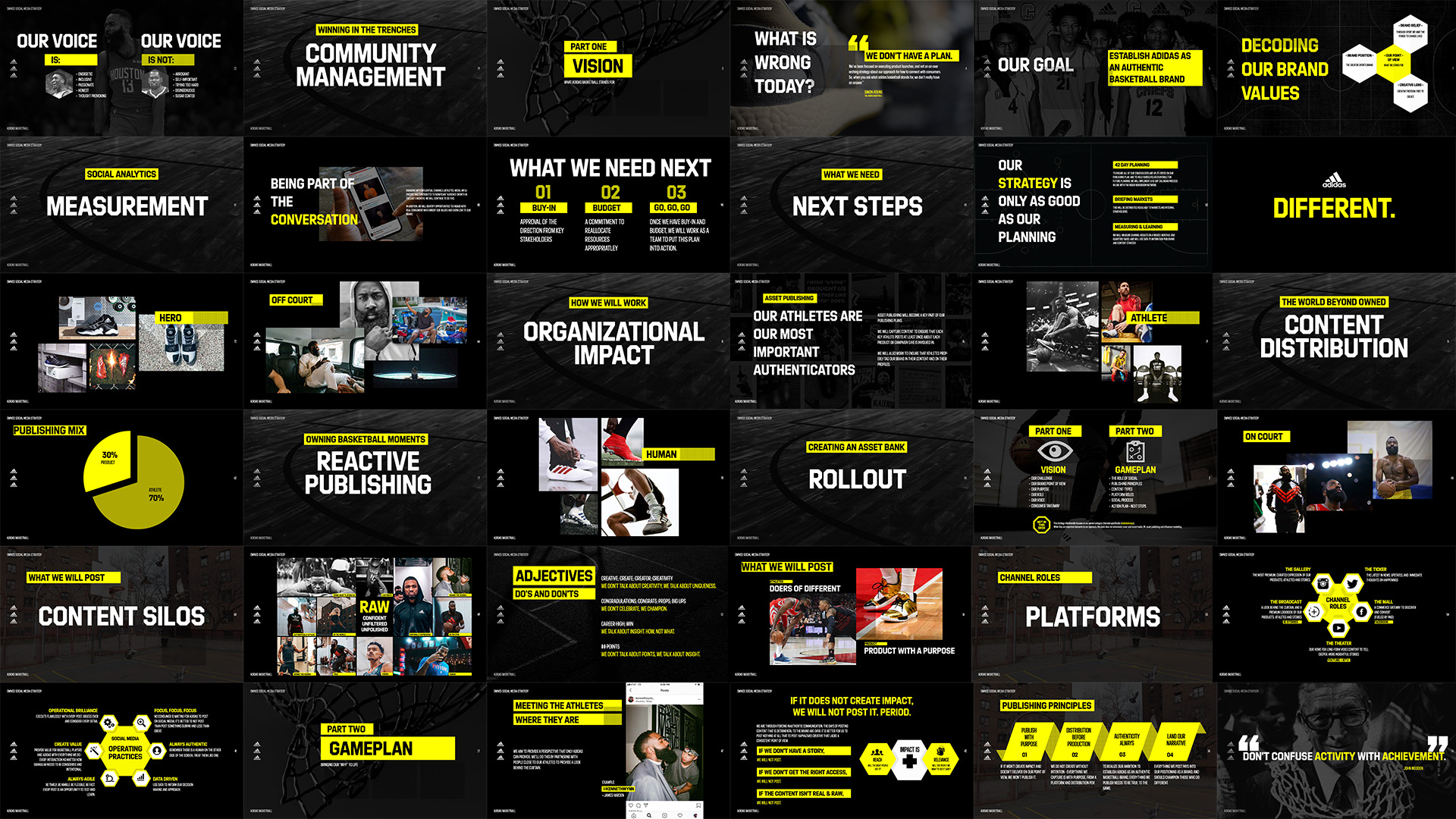 Adidas athletes need more than logos — they need a framework that connects their personal identity with the power of the adidas brand. Our “Brand Operating System” delivers exactly that: a flexible design toolkit built on consistency, clarity, and adaptability.